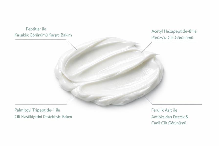 Yaşlanma karşıtı peptit içerikli bakım kremi,cildin daha nemli ve ışıltılı bir görünüm kazanmasına yardımcı olur.