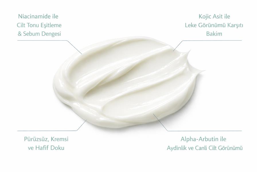 Koyu leke görünümünün azalmasına yardımcı olur. Düzenlenmiş bir cilt tonu ile aydınlık bir görünüm kazandırır.