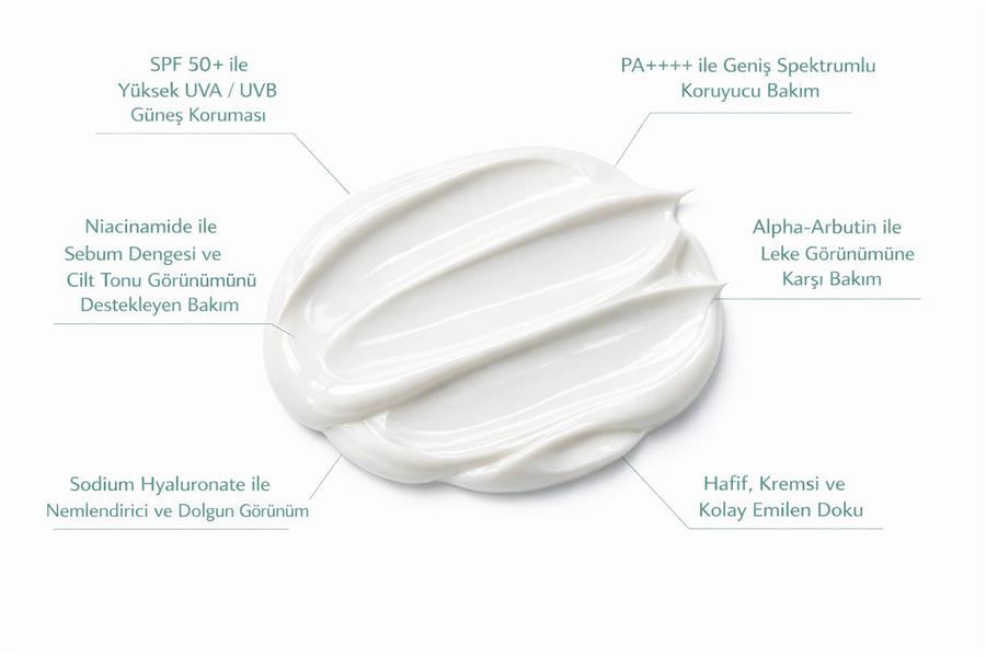 Ciltte yağlanmaya sebep olmadan UV koruması hedefler, İçerdiği nemlendirici aktiflerin desteği ile ciltte nem dengesini korur, Cildin nemli, ışıltılı ve yumuşak bir görünümde olmasına yardımcı olur. Oluşmuş lekelerin onarımına yardımcı olur, yeni leke oluşumunu engellemeyi hedefler.